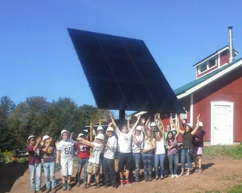 Above: Students at Delaware Academy in Delhi celebrate the installation of solar panels at the school's sugarhouse. Photo via Catskill Solar's Facebook page.