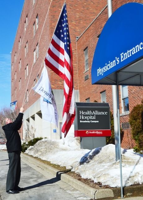 Above: HealthAlliance Security Manager Martin Duffy raises a “Donate Life” flag in front of the HealthAlliance Hospital: Broadway Campus Wednesday. The flag, whose inscription also says “Donation Saves Lives,” will fly in front of the hospital for a week before being given to the organ donor’s family.