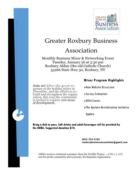 This is a potluck event: please, bring along a dish to pass. Soft drinks and adult beverages will be provided by the GRBA. The event is free and open to the public. A suggested donation of $10 will help GRBA advance its mission to continue to foster economic development opportunities in Roxbury. For more information, call (845) 254-3103 or email roxburybusinessassociation@gmail.com.